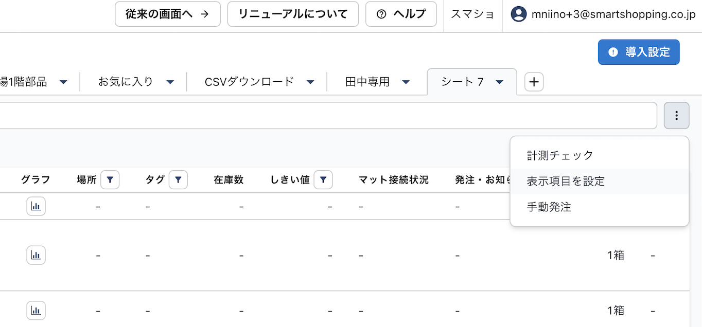 「在庫商品」画面の [︙] >[ 表示項目を設定 ]から、項目を追加します。