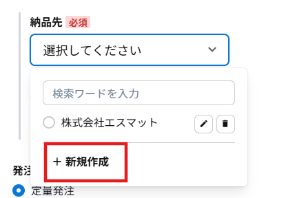 - 納品先:作成済の納品先が選択肢に表示されるので、選択する