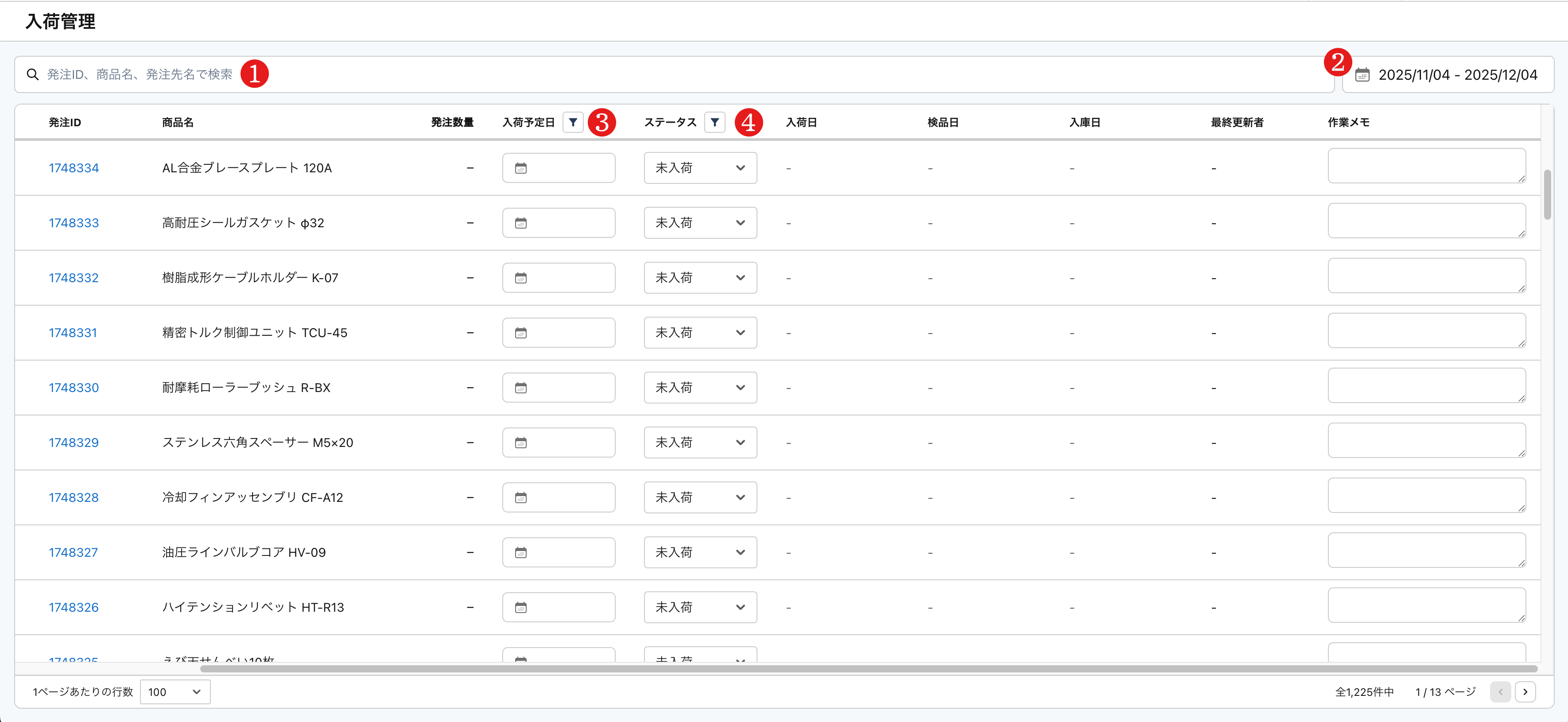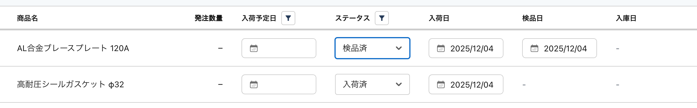 | ステータス | 入荷の進行状態 | 「未入荷 / 入荷済 / 検品済 / 入庫済」から選択可能 各ステータスでフィルタ可能 |