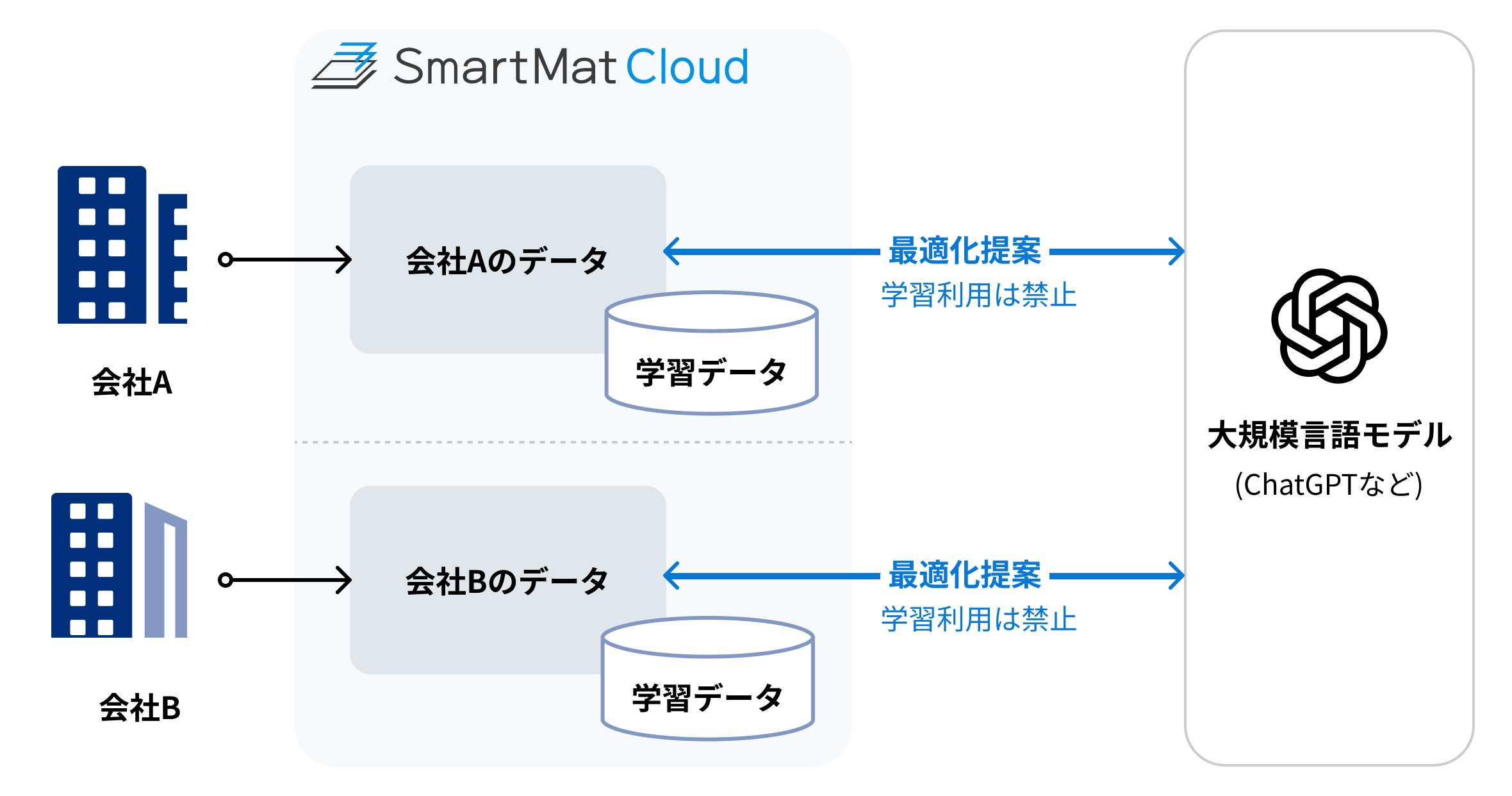 図に示される通り、お客様ごとのデータは論理的に分離されており、他社の最適化提案等にデータが混在することはありません